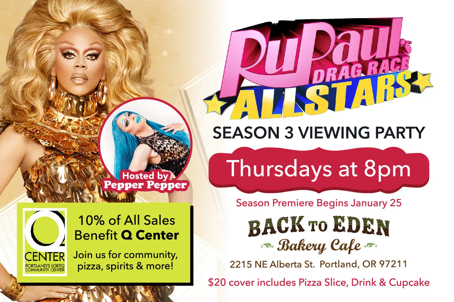 We are super excited to announce that Back to Eden Bakery Cafe on Alberta Street will host weekly Thursday night viewing parties for fans of RuPaul's Drag Race All Stars, Season 3!
